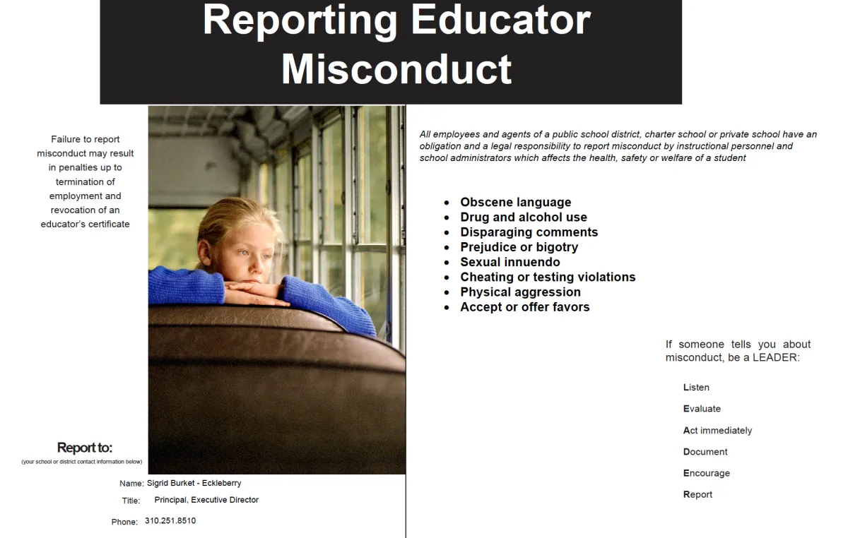 At Every Kid’s A Genius/Generation S.I.G. all employees have an obligation and legal responsibility to report misconduct by instructional personnel and school administrators which affects the health, safety or welfare of a student. Failure to report misconduct may result in penalties up to termination of employment.